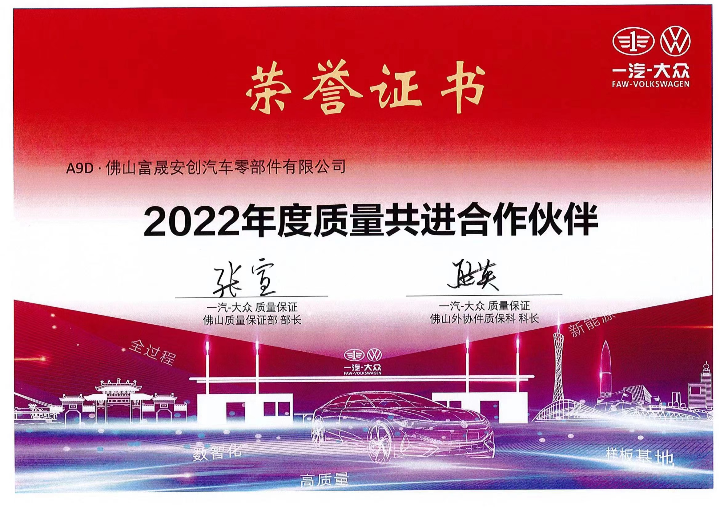 佛山哔咔漫画 安创荣获一汽大众佛山质保部荣誉