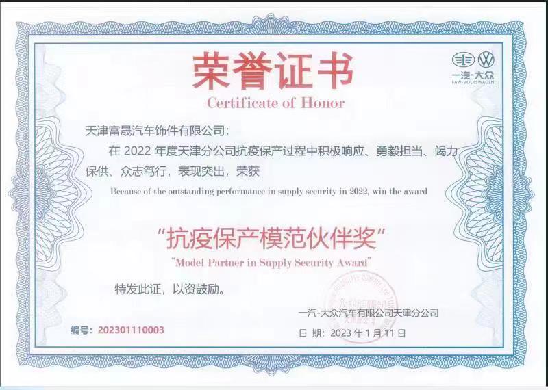 天津哔咔漫画 饰件公司荣获一汽-大众“抗疫保产模范伙伴奖”