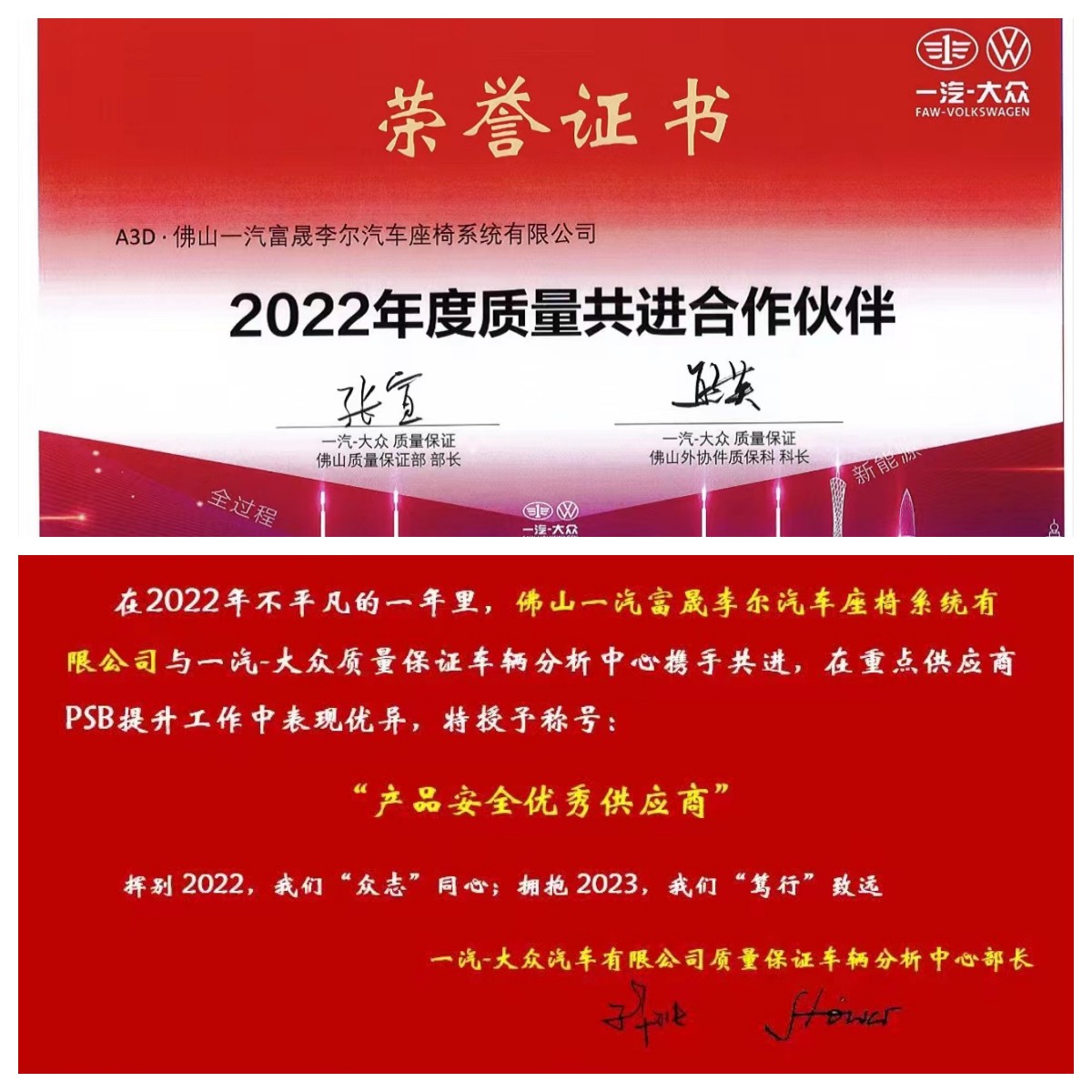 佛山哔咔漫画 李尔座椅公司喜获一汽大众双料荣誉